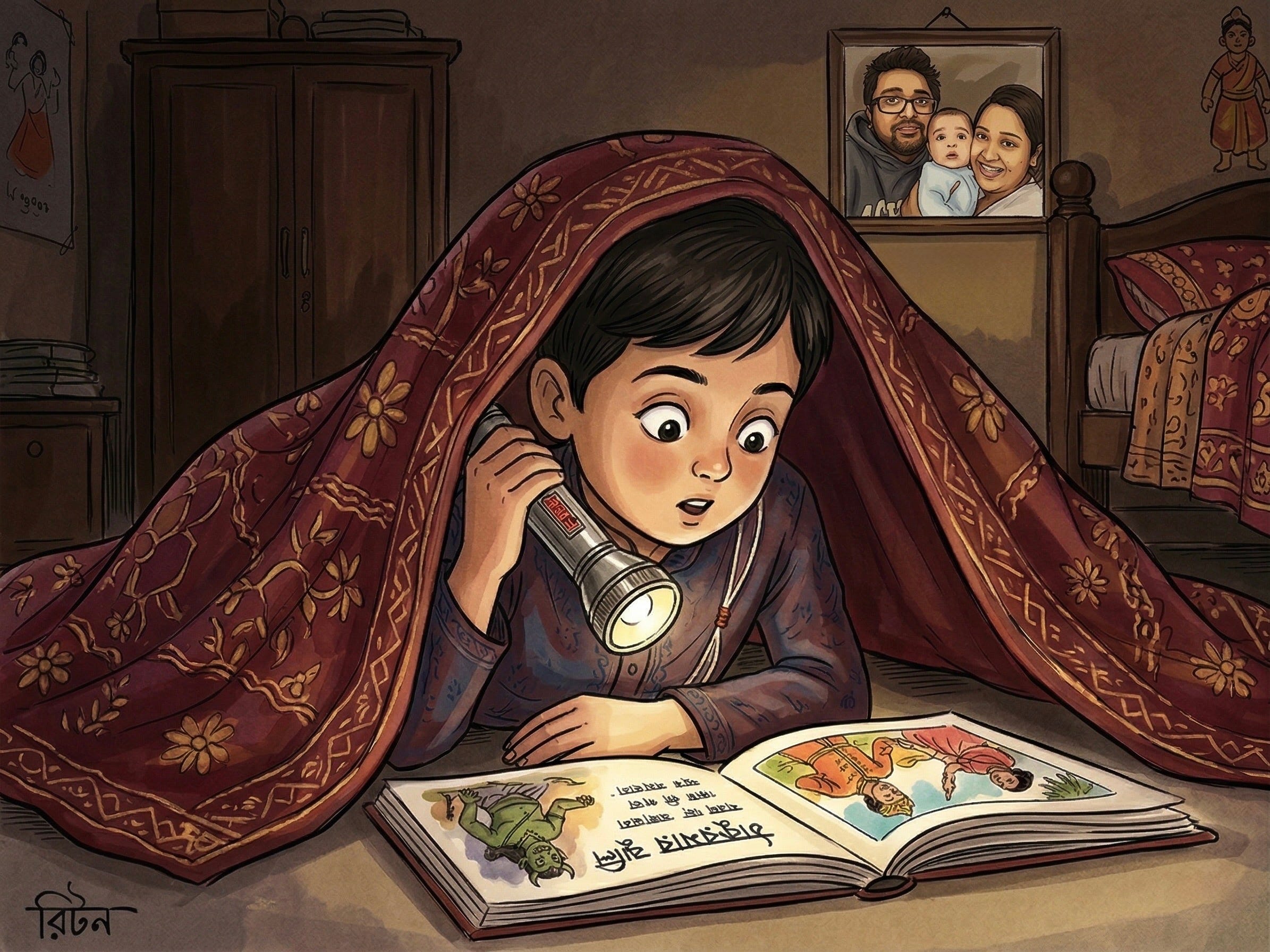 আমাদের ছেলেটা যখন এই দুনিয়ার আলো দেখেনি, মায়ের পেটের ভেতর অন্ধকার, উষ্ণ, জলের মতো এক গোপন ঘরে ভেসে আছে, তখন থেকেই আমরা তার দিকে বই খুলে বসতাম। কে শুনছে, কতটুকু শুনছে, আদৌ শব্দ আলাদা করতে পারছে কি না, সেসব নিয়ে খুব বড়ো কোনো বৈজ্ঞানিক নিশ্চয়তা ছিল না, কিন্তু রাতের শেষে বিছানার ধারে বাতি একটু ম্লান করে, কখনো আমি, কখনো তার মা, পাতা উল্টে উল্টে তাকে পড়ে শোনাতাম, যেনো ভাষা আগে আসে, পৃথিবী পরে; যেনো মানুষের ঘরে জন্মাতে হলে আগে শব্দের ঘ্রাণ চেনা দরকার, বাক্যের ওঠানামা, স্বরের ভেতরের স্নেহ, বিরক্তি, হাসি, বিস্ময়, থেমে যাওয়া, আবার শুরু করা, এইসব। তারপর সে জন্মালো, কোলে এলো, কাঁদলো, ঘুমালো, দুধ খেলো, রাত জাগালো, আর সেই সঙ্গে বই পড়ে শোনানোর অভ্যাসটাও ঘরের একটা নিয়মের মতো থেকে গেলো। ঘুম পাড়ানোর আগে বই, বিকেলের অবসরে বই, জ্বরের দিনেও বই, বাইরে বৃষ্টি হলে বই, বিদ্যুৎ গেলে টর্চ জ্বেলে বই। অনেক বাবা-মা বোধহয় এই জায়গায় এসে থামে, ভাবে বাচ্চা নিজে পড়তে শিখলেই কাজ শেষ, কিন্তু আমাদের আসল কাজটা যেনো সেখান থেকেই শুরু হলো। কারণ পড়তে শেখা আর পড়ুয়া হয়ে ওঠা এক কথা না। অক্ষর মিলিয়ে শব্দ পড়া এক জিনিস, আর বইয়ের ভেতর ঢুকে থাকা, বইকে নিজের আনন্দ, আশ্রয়, সঙ্গী, খেলা, অভ্যাস, কখনো গোপন জায়গা বানিয়ে নেওয়া আরেক জিনিস। সেই দ্বিতীয় পথটাই আমরা ধরতে চেয়েছিলাম।