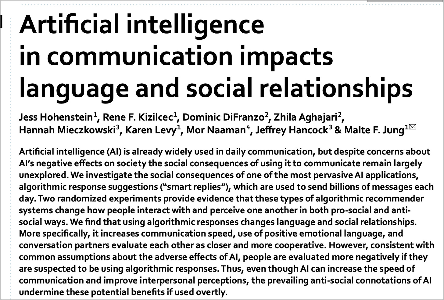 AI-এর প্রভাব আরও স্পষ্ট স্মার্ট রিপ্লাই, অটোকরেক্ট, স্পেলচেক ইত্যাদিতে। কর্নেল ইউনিভার্সিটির এক গবেষণায় দেখা গেছে, স্মার্ট রিপ্লাই ব্যবহারে ব্যবহারকারীরা নাকি বেশি “পজিটিভ” শব্দ বেছে নেন, ফলে চ্যাটে সহযোগিতার মাত্রা বাড়ে। কিন্তু সমস্যা হচ্ছে—যদি মনে হয়, আপনার সঙ্গী AI ব্যবহার করছে, তখনই আপনি তাকে কম সহযোগিতা করতে শুরু করেন। মানে, বাস্তবে AI ব্যবহার নয়—AI ব্যবহারের সন্দেহই সম্পর্কের ভেতরে অবিশ্বাস ঢুকিয়ে দেয়।