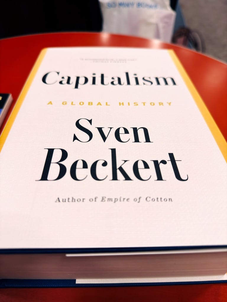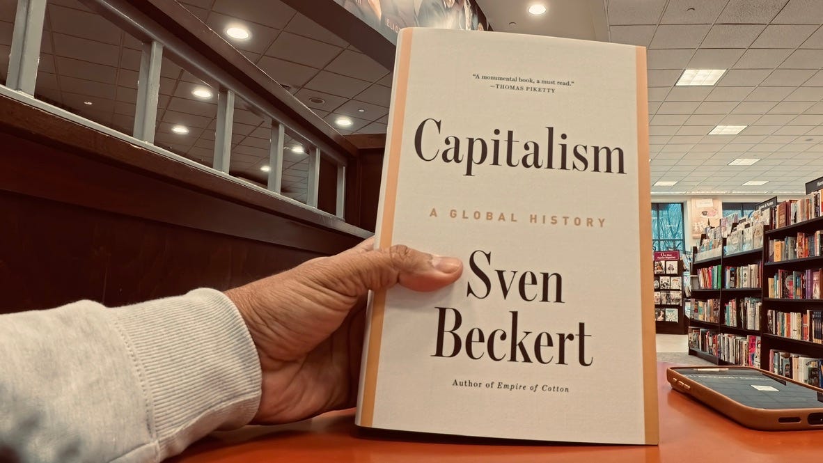 স্ভেন বেকার্ট ক্যাপিটালিজমের এমন ইতিহাস লিখেছেন, যেটা অডেনের বন্দর থেকে শুরু করে ১৩০০ পাতা টলটলিয়ে পৃথিবী ঘোরে। অডেন শুনলেই পাঠকের মধ্যে একটা বহিরাগত গন্ধ আসবে, কিন্তু বেকার্ট বলছেন, “না ভাই, ক্যাপিটালিজম কোনো নেটিভ ইউরোপীয় সন্তান নয়। এটা বরং এক ধরনের গ্লোবাল কোলাজ – কায়রো আর চাংঝো একসঙ্গে মিশে গিয়ে যে খিচুড়ি রান্না করেছে।” এমন রান্নার রেসিপি সাধারণত পছন্দ করেন না ইতিহাসবিদেরা, কারণ Cold War-এ “capitalism” শব্দটাই নাকি অশ্লীল। তখন সবাই বলতেন “the economy,” যেন কেউ হয়তো পেঁয়াজ বলার বদলে পুষ্টিগুণ সম্পন্ন গোলাকার সবজি বলে হাঁটছে। বেকার্ট সেই চোখ টিপে-যাওয়া ভদ্রলোকদের ডেকে বললেন, “নাম ধরে ডাকো। এই জন্তুটার নাম ক্যাপিটালিজম।”