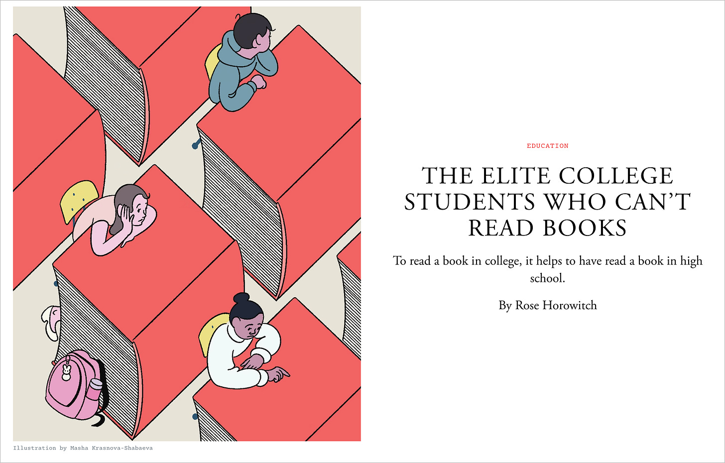 সম্প্রতি প্রকাশিত রোজ হোরোভিচের প্রবন্ধ The Atlantic এ বেশ হৈচৈ ফেলে দিয়েছে। তিনি বলছেন যে অনেক অভিজাত কলেজ শিক্ষার্থী বই পড়তে পারছে না, বিশেষত উপন্যাসের মতো লম্বা লেখা। শুনতে যতটা অদ্ভুত লাগছে, সমস্যা কিন্তু খুবই গুরুতর। তবে হোরোভিচের এই বিশ্লেষণ নিয়ে একটু খুঁটিয়ে ভাবা দরকার, কারণ তিনি কিছুটা নাটকীয়ভাবে হাই স্কুলগুলোকে দায়ী করছেন, অথচ তার প্রবন্ধে শক্ত প্রমাণের বড্ড অভাব আছে। আর সেই ভাবনাতেই আমি হাজির করছি আমার কিছু (কেউ কেউ বলবে মূল্যহীন) চিন্তা।